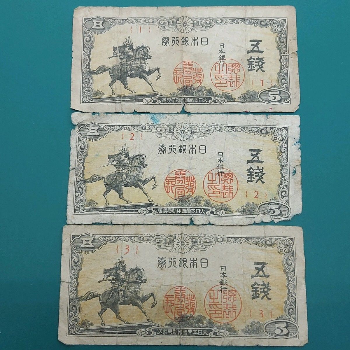 - 美術品・アンティーク・コレクション > コレクション > 【再お値下げ】旧紙幣 日本銀行券 楠公5銭札【未使用・希少】 楠公5銭紙幣 日本銀行券5銭札 おまとめ3点(1・2・3) 騎乗した楠木正成