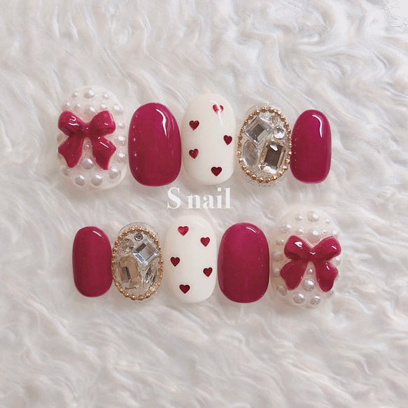 - ネイルケア > ネイルチップ・付け爪 > 107))ネイルチップ フレンチガーリー リボンネイル クリスマスネイル ハート ネイルチップ ボルドー 赤 リボン ハート ストーン フレンチガーリー