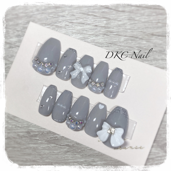 - ネイルケア > ネイルチップ・付け爪 > 54))リボンネイルチップ フレンチガーリー シンプル ブルーネイル 量産型 現品ネイルチップ*グレーのシンプル韓国ネイル 量産型 地雷系 リボン