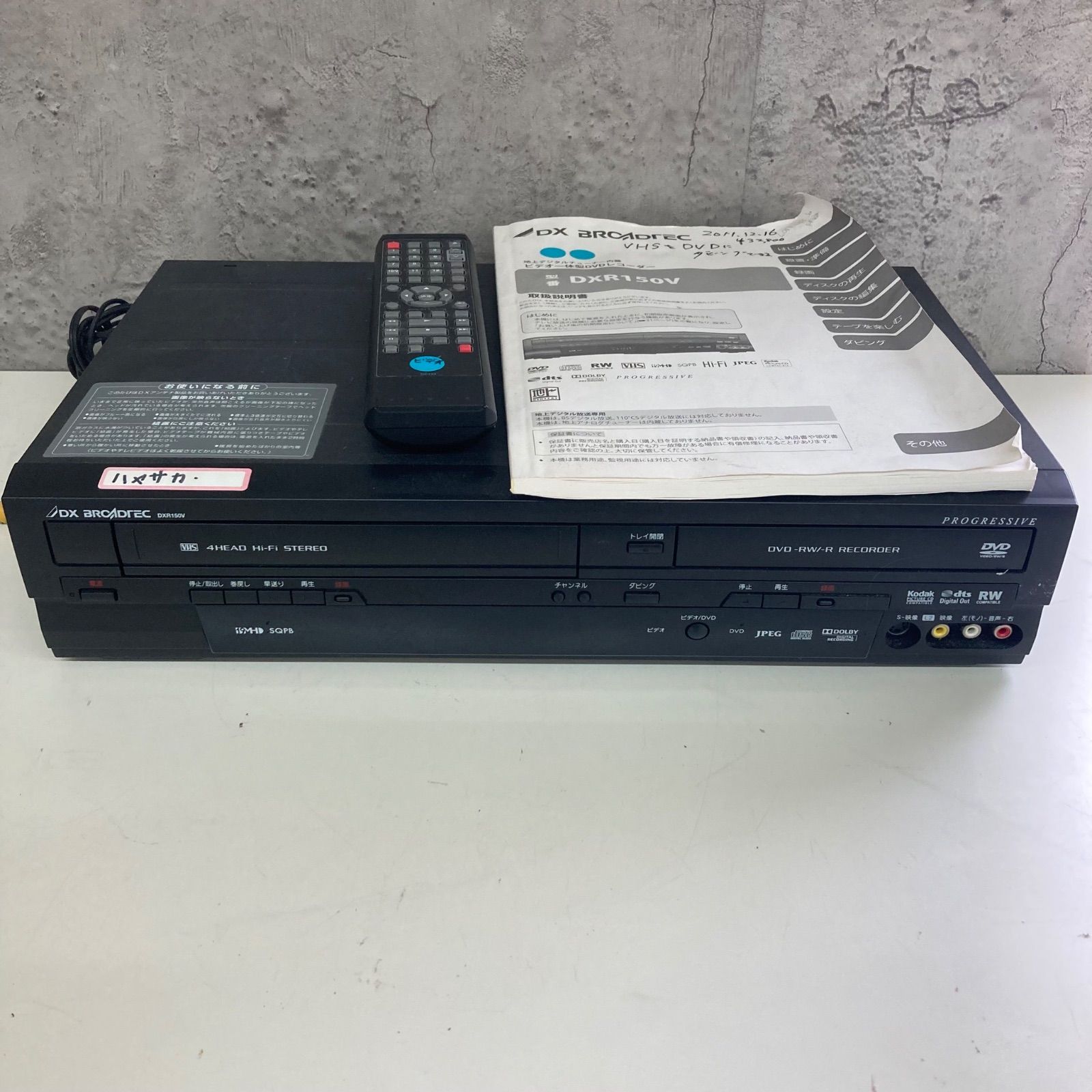 | 商品の特徴 | DXアンテナ DXR150V ビデオ一体型DVDレコーダ テレビ ダビング Amazon。Amazon | 地上デジタルチューナー内蔵 ビデオ一体型DVDレコーダー。DXアンテナ 地デジ簡易チューナー搭載ビデオ一体型DVDレコーダー。地デジチューナー内蔵のDVDレコーダー他にも電化製品を多数出品しています!#sakaeショップ電化製品 はこちら!不用品回収にて引取りの品です。DVD・VHS再生確認済み。他未確認。現状お渡しにて有効活用頂ける方よろしくお願いいたします。- モデル: DXR150V- 機能: 地デジチューナー内蔵- タイプ: ビデオ一体型DVDレコーダー- オーディオタイプ: 4ヘッドHi-Fiステレオ- 付属品: リモコン、取扱説明書、地デジカード、3色コード- 接続端子: 映像・音声出力端子。地デジ対応デラックスアンテナDVDレコーダー(VHSテープ対応)DXR150V。SONY BDZ-ZW1000 1TB ブルーレイレコーダー ソニー。A5 TOSHIBA ビデオ一体型DVDレコーダー D-VR7 動作確認済み。SONY ブルーレイディスクレコーダー BDZ-EW500(500GB) | ||