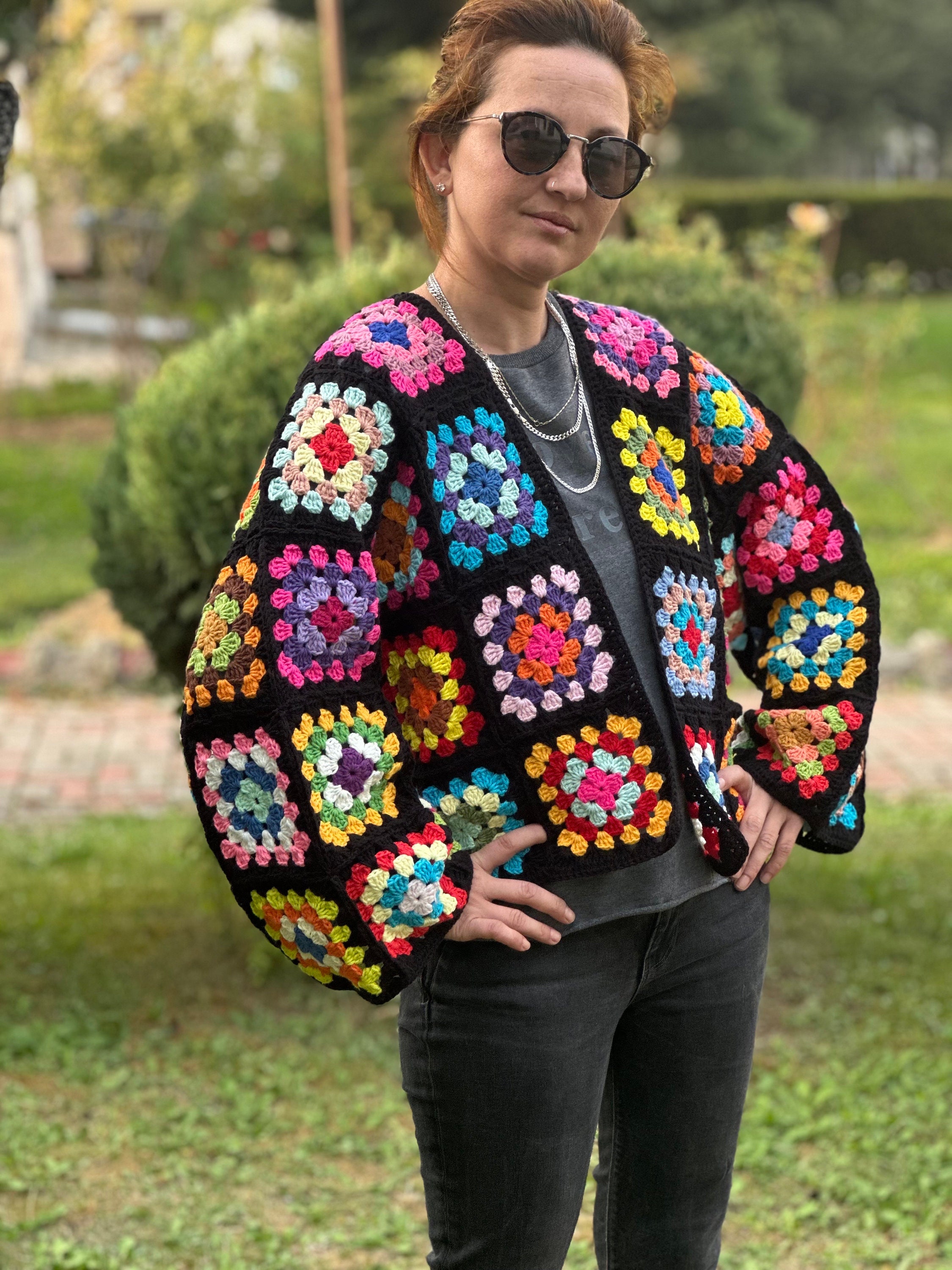 LEINWANDE Fruits Mix Crochet Cardigan 黒 Crochet Black Cardigan, Black Granny Square Cardigan, Crochet