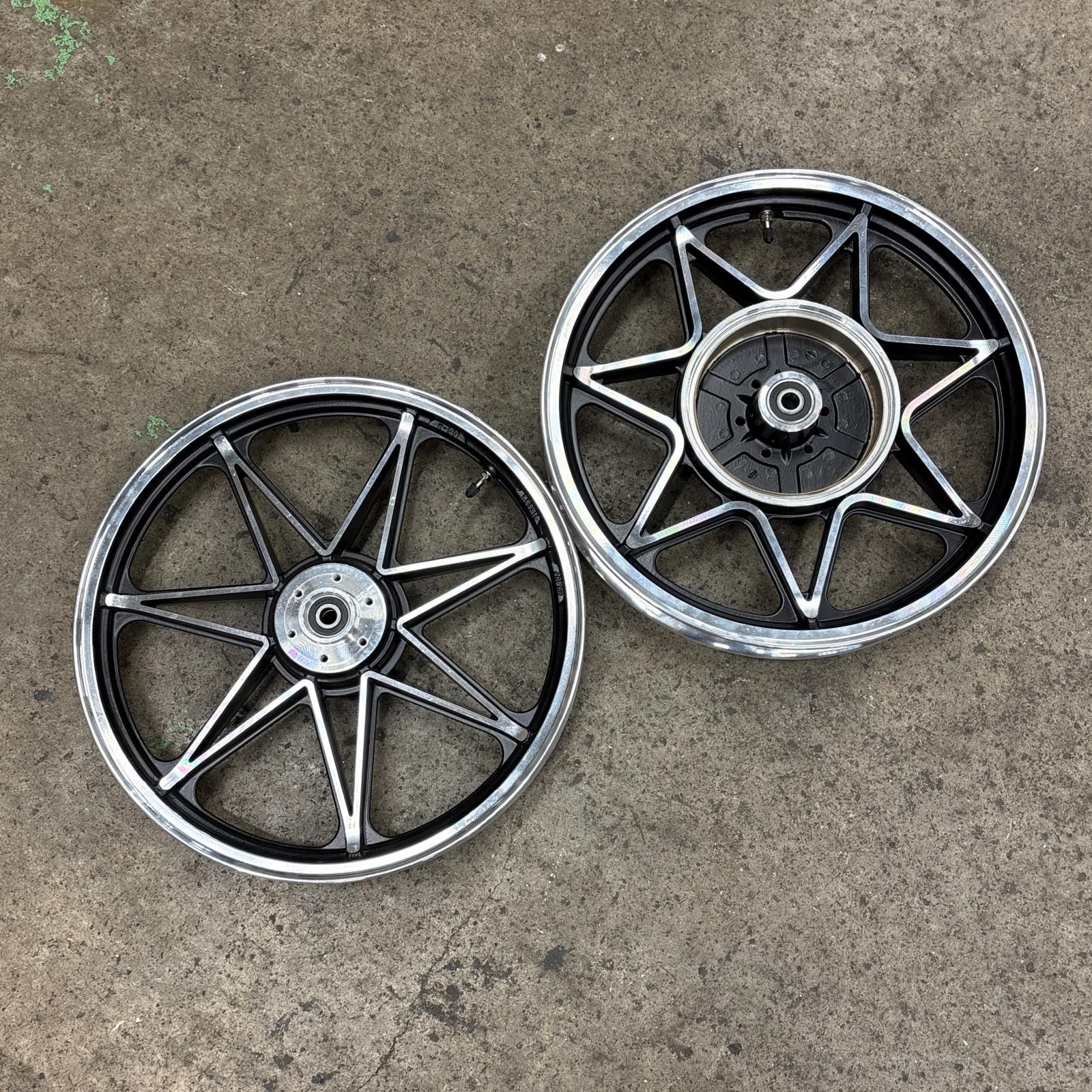| 商品の特徴 | スズキGSX400E GS400星キャス前後 フロントフォークセット18インチ。スズキGSX400E GS400星キャス前後 フロントフォークセット18インチ。スズキGSX400E GS400星キャス前後フロントフォークセット18インチ。ご観覧いただきありがとうございます。GSX400Eのフロントフォーク、ホイールセットです。 Wディスクに変更したため出品いたします。写真の物で全てになります。 ボルト類は無いと思います。いかなる理由であっても返品不可ですので、よく写真を見て判断してください。【フロントフォーク】純正フロントフォークでサビ、キズはありますが、曲がり、歪みなどはないと思います。 シール類も今の所 漏れ等はございません。 【星形キャスト】純正18インチの前後です。 シングルディスクで歪みや曲がりは無いと思います。 タイヤもまだ山はあるのでそのまま使えると思います。【その他】パーツ類はオマケとしてお付けしますので、使えるかどうかは定かではありません。※発送は物が物だけにかなり大きい荷物で何個口かになると思うので、値引きは致しせん。わからない事があればコメントからお願いいたします。GSX400E ザリ ゴキ GS400 スズキ SUZUKIメーカー···スズキ車種···GSX。スズキGSX400E GS400星キャス前後 フロントフォークセット18インチ。zrx400 ホイール 前後セット ブレーキローター スプロケ付き。KAWASAKI AR50前後ホイールセット。ジャイロX キャノピー ジャイロアップ 純正リアホイール、フロントホイールセット。z900rs純正タイヤホイールセット。ジョグsa16 ホイール フォーク キャリパー他セット。カ*ス様 ハーレー ツーリング 5本スポークホイール 前後セット。★値下げ セロー250 フロントホイール。⑦EXCEL 18インチ ホイール CB750K4 40h H型。12月16日まで値引き モンキー 8インチ 4jホイール duro新品タイヤ付き。【 フロント】AR1モタードホイールキット (ステンレススポーク) トレール。早い者勝ち価格!バリ山!スズキ バンバン200 限定車 純正 フロントホイール。カブ110 プロ JA07 フロントホイール ブレーキパネル付き 美品。NS-1 ホイール 前後セット フロント リア ブレーキディスク | ||